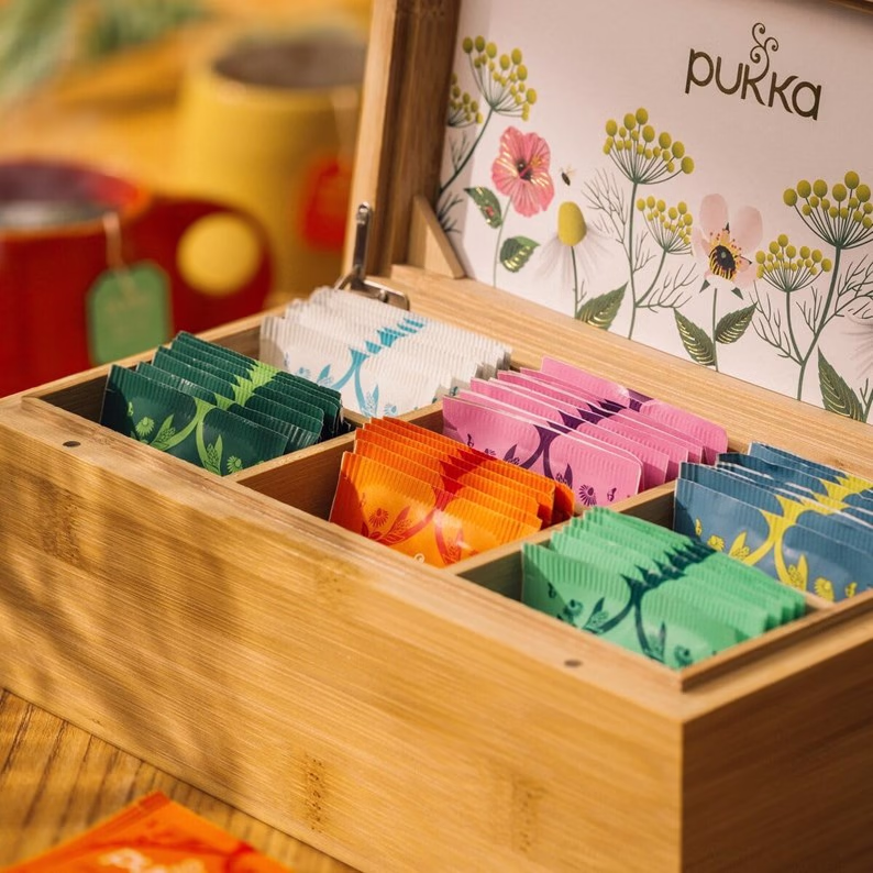 Ce coffret rassemble 42 thés et infusions bio Pukka dans une boîte en bambou réutilisable. On y découvre six mélanges emblématiques : Trois Gingembres, Relax, Matcha Suprême, Baie de sureau et Échinacée, Menthe poivrée et Réglisse, Feel New. Un cadeau chaleureux pour varier les saveurs et savourer une tasse réconfortante à tout moment de la journée.