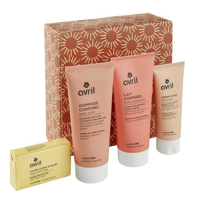 Ce coffret Avril réunit 4 soins bio pour une routine complète tout en douceur : un gommage pour le corps qui lisse la peau, un lait hydratant, une crème pour les mains nourrissante et un savon au parfum fleur de tiaré. Les textures sont simples, agréables, faciles à adopter au quotidien. Un ensemble pensé pour créer un moment de soin du corps calme et naturel.